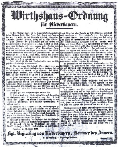 Wirtshausordnung für Niederbayern, „Außerordentliche Beilage“ zum Intelligenz-Blatt von Niederbayern Nr. 5 vom 19.1.1853, veröffentlicht von der Königlichen Regierung von Niederbayern, Kammer des Innern in Landshut am 12.1. 1853, verschickt vom Landgericht Bogen, Staatsarchiv Landshut, Amtsbibliothek (K-8°686)
