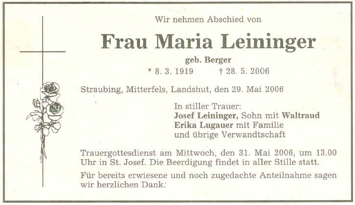 Trauergottesdienst am Mittwoch, den 31. Mai 2006, um 13.00 Uhr in St. Josef. Die Beerdigung findet in aller Stille statt.