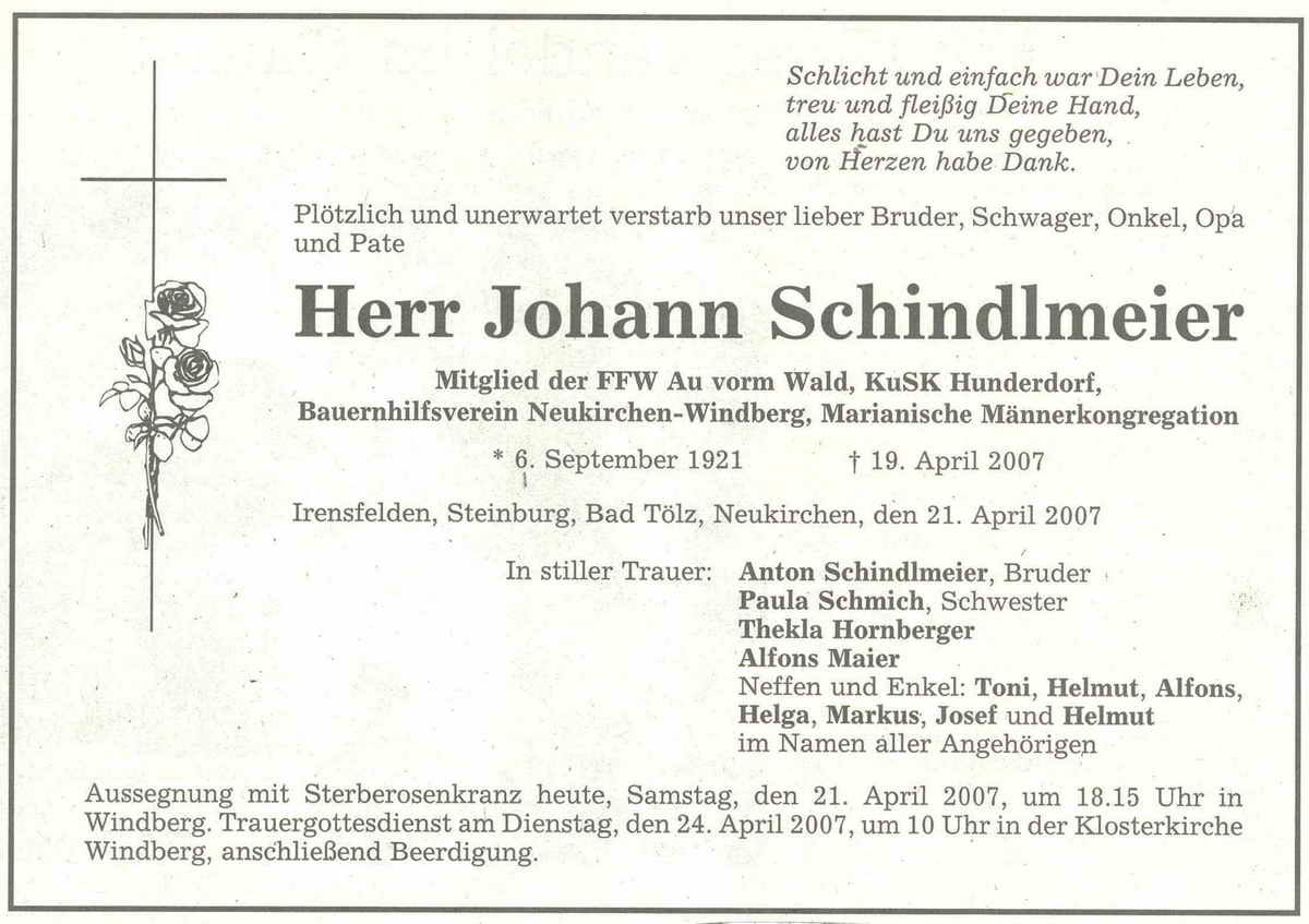 Aussegnung mit Sterberosenkranz heute, Samstag, den 21. April 2007, um 18.15 Uhr in Windberg. Trauergottesdienst am Dienstag, den 24. April 2007, um 10 Uhr in der Klosterkirche Windberg, anschließend Beerdigung.