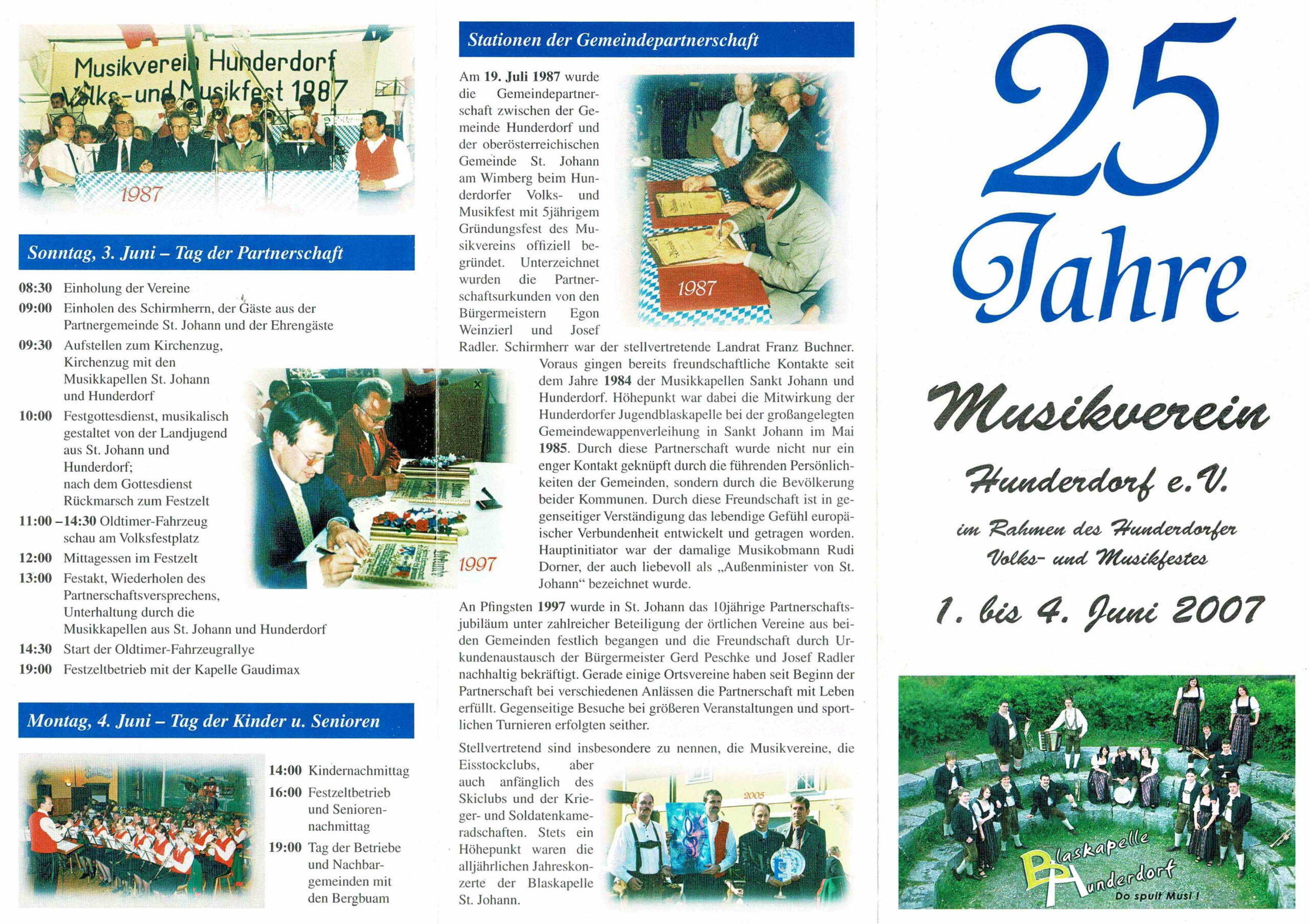 Bürgermeister Peschke führte aus, dass der offiziellen Partnerschaft freundschaftliche Kontakte der Musikkapellen seit 1984 vorausgegangen seien, die vom damaligen Musikvereinsobmann von Sankt Johann, Rudi Dorner eingeleitet worden waren. Bereits 1985 wirkte die Hunderdorfer Jugendblaskapelle bei der Gemeindewappenverleihung in Sankt Johann mit. Nach Zustimmung der Gemeindegremien wurde beim Volks- und Musikfest 1987 die Gemeindepartnerschaft besiegelt von den Bürgermeistern Josef Radler und Egon Weinzierl. Der Hauptinitiator Rudi Dorner wurde fortan auch liebevoll als „Außenminister von Sankt Johann“ bezeichnet.