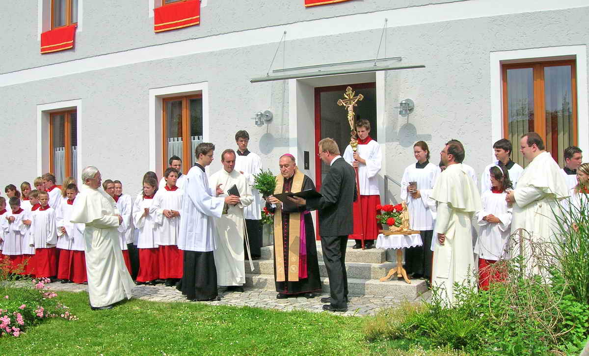 Der Gottesdienst wird musikalisch mitgestaltet vom Kirchenchor und einer Gruppe der Regensburger Domspatzen (Dominik Paukner). Im Anschluss nimmt der H. H. Bischof die Segnung des generalsanierten Pfarrhauses vor. Für die teilnehmenden Pfarrangehörigen gibt es abschließend auch einen kleinen Umtrunk. Pfarrer Martin Müller richtet ein herzliches „Vergelt’s Gott“ an Architekt Wittl vom Staatlichen Bauamt Landshut für die Planung und Durchführung der Renovierungs-Maßnahme, an die beteiligten Firmen, die gute Arbeit leisteten, weiterhin an Finanzdirektor Domkapitular Hüttner und Herrn Eisinger von der Bischöflichen Finanzkammer sowie F. Weiherer-Mulzer vom Diözesan-Bauamt für die fachliche Begleitung und die vielen „Tipps“.
