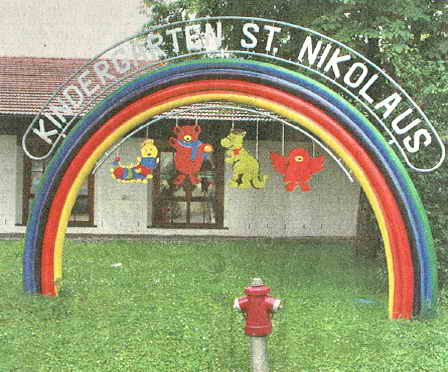 Bei einem Besuch in Hunderdorf fällt mir der große Regenbogen neben dem Kindergarten St. Nikolaus auf. Mit dem Regen, der gerade fällt im Bayerischen Wald, hat er nichts zu tun und wohl auch nicht mit dem Wasserhydranten, der davor steht. Er erinnert mich aber daran, dass ich schon vor einigen Jahren, nach der Klage einiger Eltern, kritisch über die Zustände im Kindergarten von Hunderdorf geschrieben habe. Bürgermeister Gerhard Peschke war darauf so verärgert, dass er seither nicht mehr mit mir gesprochen hat. Der schöne Regenbogen lässt vermuten, dass sich die Dinge im Kindergarten zum Guten gewendet haben und vielleicht komme ich auch mit Bürgermeister Peschke irgendwann wieder ins Gespräch. Es muss ja nicht unbedingt über den Kindergarten sein.