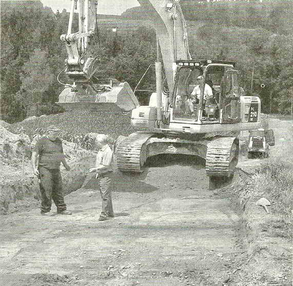 DIE MASSNAHME ZUR HOFERSCHLIESSUNG im Ortsteil Hoch der Gemeinde Hunderdorf ist voll im Laufen. Vor etwa zwei Wochen wurde mit dem Humus- und Bodenabtrag an der Trasse begonnen. Die Verbreiterung des Wirtschaftsweges musste hangseits erfolgen. Zwischenzeitlich wird die Schottertragschicht eingebaut. Die Mitverlegung der Telefonkabel verzögert sich, wie die Baufirma Bürgermeister Gerd Peschke anlässlich einer Baustellenbegehung informierte. In etwa vier Wochen soll die Maßnahme mit der Asphaltierung abgeschlossen sein. Die Ausbaulänge beträgt rund 312 Meter. Das Bauprojekt Hoch mit geschätzten Kosten von rund 82 000 Euro ist der zweite Bauabschnitt, der vom Amt für Ländliche Entwicklung Niederbayern mit 50 Prozent geförderten Hoferschließungsmaßnahmen mit Gesamtkosten von rund 275 000 Euro. Als dritter und letzter Abschnitt ist noch der Wegeausbau Grub-Weinberg an der Reihe. – Bild: Bürgermeister Peschke (rechts) mit einem Firmenmitarbeiter. (Foto: xk)