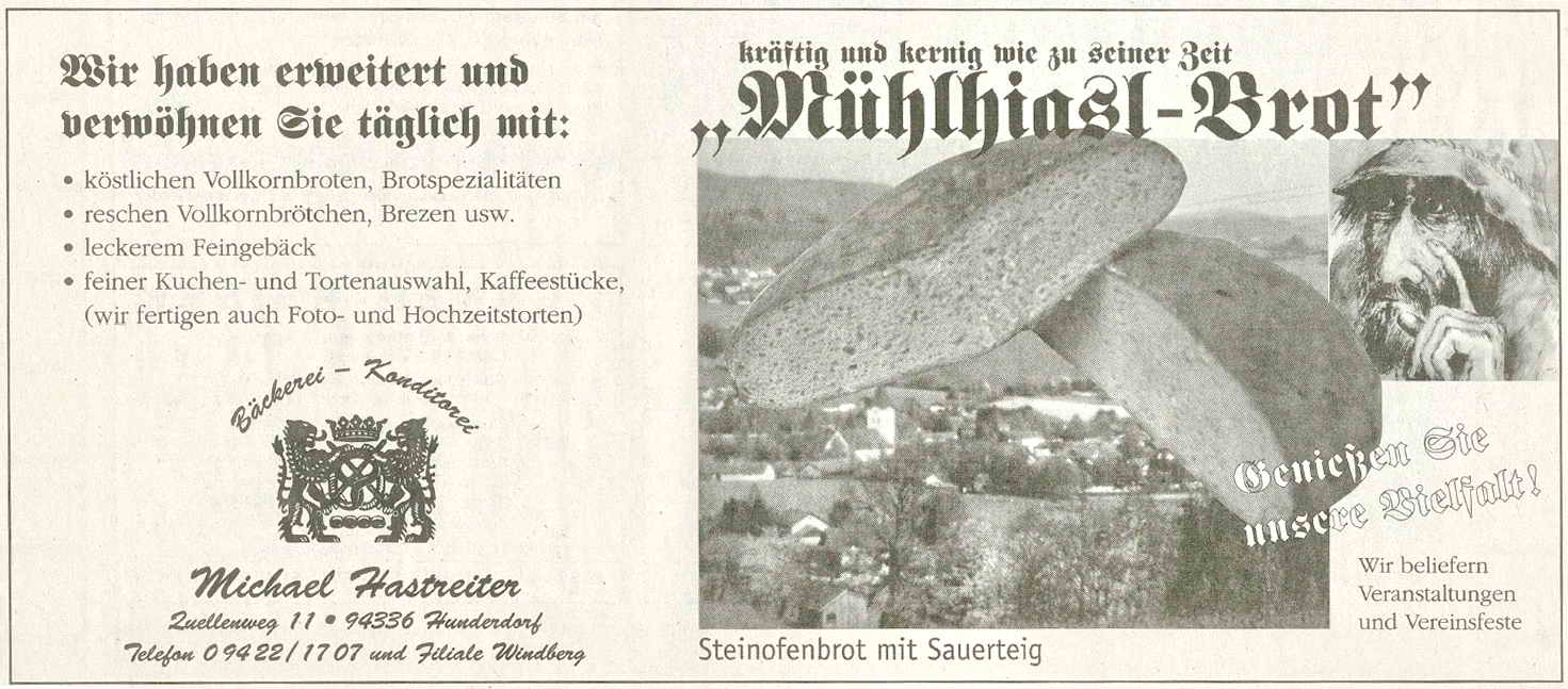 Vor gut drei Wochen wurde auch ein spezielles neues „-Mühlhiasl-Brot“ herausgebracht. Michael Hastreiter dazu: Zufällig im Gespräch mit einer Kundschaft, die sich ob der großen angebotenen Brotvielfalt vom Vollkornbrot, Misch- und Bauernbrot bis hin zum Weißbrot unentschlossen zeigte, was sie denn nun nehmen solle, entstand die Idee, ein herzhaftes Brot ohne besonderen Zutaten zu kreieren. Nach einer eigenentwickelten Rezeptur entstand ein kräftiges und kerniges Brot, wie seinerzeit mit reinem Sauerteig und Hefe, gebacken im Steinofen. Auf den Zusatz von künstlichen Backmitteln wird dabei gänzlich verzichtet, unterstreicht Michael Hastreiter. Er ergänzt, dass man für dieses besondere , Brot auch einen besonderen Namen gesucht habe. Da lag es in Hunderdorf, in der Heimat des Waldpropheten Mühlhiasl natürlich nahe, es als „Mühlhiasl-Brot“ zu bezeichnen. Der Bäckermeister freut sich, dass sich das neue Brot bereits in den ersten Tagen gut etabliert hat. Das Mühlhiasl-Brot und diverse schmackhafte Brot- und Backwaren sind neben dem Hauptgeschäft in Hunderdorf auch erhältlich in der Filiale im Klosterdorf Windberg sowie in den Edeka-Aktivmärkten Stadler und Honner in Mitterfels und Straubing (Schildhauerstraße) sowie Schroll in Neukirchen.