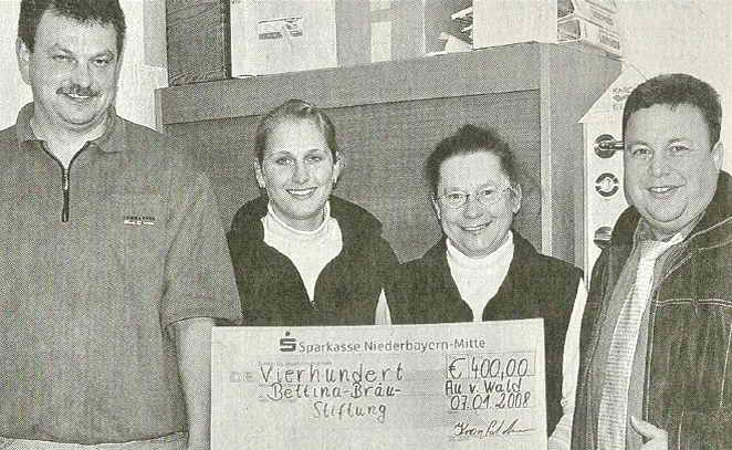 Es war 1978, als sich eine Reihe von um Hunderdorf ansässigen jungen Leuten zusammenschloss, um im Gasthaus Freudenstein in Au vorm Wald den „Stammtisch der Au’inger“ zu gründen. Und zwar nicht nur, um Geselligkeit zu pflegen, sondern um mit verschiedenen Aktionen soziale Zwecke zu unterstützen. Seit Jahren beispielsweise schon kann sich Irmgard Bräu, Initiatorin und Beirat der Bettina-Bräu-Stiftung „Mehr Leben für krebskranke Kinder“ über Zuwendungen dieses in diesem Jahr sein 30-jähriges Jubiläum ganz groß mit Zeltbetrieb feiernden Stammtisches freuen. Am Dienstagabend konnte sie aus den Händen von Vorstand Gerhard Kronfeldner die beträchtliche Spendensumme von 400 Euro entgegennehmen. „Das Geld stammt aus unserer alljährlich, so auch 2007, veranstalteten Nikolausaktion“, sagte Kronfeldner und verband damit gleichzeitig seinen Dank an alle Familien, die die Nikolauspaare Johann Hornberger/Christoph Leidl. Und Ludwig Schreiner/Stefan Kronfeldner samt ihren Kutschenfahrern Ewald Brunner und Thomas Hornberger aufgenommen hatten. Gerade zur rechten Zeit käme der großzügige Betrag, um die inzwischen auf fünf Einheiten angewachsenen Elternwohnungen in der Nähe des Dr. Haunerschen Spitals in München weiter zu finanzieren, stellte die unermüdlich um Spenden besorgte Irmgard Bräu fest. „Ihr glaubt gar nicht, von welch unschätzbarem Wert es ist, wenn die kleinen krebskranken Mädchen und Buben ihre Mütter und Väter in ihrer Nähe haben dürfen“, wandte sie sich mit einem herzlichen „ Vergelt’s Gott“ an die Au’inger. Die Zuwendung und Aufmerksamkeit der Eltern helfe sehr, psychische Probleme zu verhindern. In den Elternwohnungen, deren Unterhaltskosten die Stiftung trage, übernachteten jedes Jahr weit über 2000 Personen. – Bild: Irmgard Bräu (Dritte von links) freute sich sehr über die Spende, die ihr Stammtisch-Vorsitzender Gerhard Kronfeldner mit den Vorstandsmitgliedern Magdalena Meier und Hans Hornberger (von links) für die Bettina-Bräu-Stiftung überreichte. (Foto: dw)