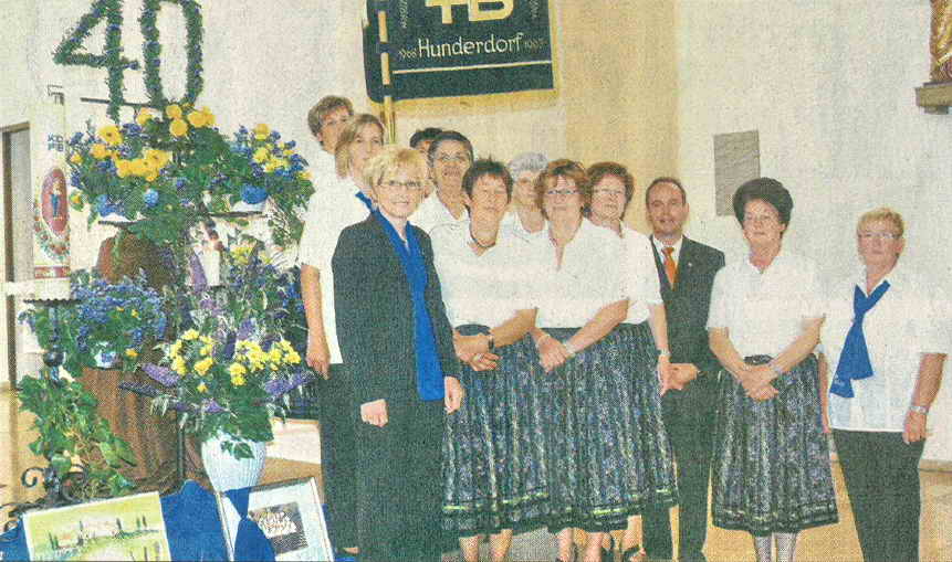 Pater Martin überschrieb seine Festpredigt mit dem Titel: „Die Elf – Die Zwölf – Der Frauenbund“ und sagte, dass es neben unserer Fußball-Nationalmannschaft noch eine ganz andere Mannschaft gegeben habe. Er meinte damit die zwölf Apostel, die ihr „Trainer“ Jesus ausgesandt habe, um ‚die Kraft Christi weiterzutragen und die Kirche zu einer weltweiten Größe zu machen. Der Geist von damals wurde spürbar. Vor 2000 Jahren durch die zwölf Apostel im Heiligen Land, in der letzten Woche durch die Fußball-Elf in Österreich und in der Schweiz und seit 40 Jahren durch den Frauenbund in Hunderdorf. Der Kirchenchor gestaltete unter Leitung von Waldfriede Holzapfel den Festgottesdienst mit der Bauernmesse. In der Kirche war auch noch eine Litfaßsäule aufgestellt, wo sich der Frauenbund Hunderdorf in 40 Jahren Bilder, Zeitungsberichte und Frauenbundgeschichte präsentierte.
