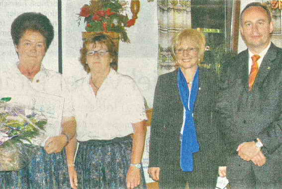 Eine besondere Auszeichnung erfuhr die Vorsitzende Angela Söldner für ihre 26-jährige Tätigkeit als Vereinsvorsitzende. Ihr wurde ebenfalls die goldene Ehrennadel des Diözesanverbandes von Elisabeth Popp angeheftet und diese würdigte auch die langjährige ehrenamtliche Tätigkeit Angela Söldners an der Spitze des Frauenbundes. Die stellvertretende Vorsitzende des Frauenbundes Hunderdorf, Therese Mauthner, überreichte ihr im Namen aller Mitglieder eine Jubiläums-Urkunde und einen Blumenstrauß für ihr Engagement. Alle Frauenbundmitglieder erhielten als Jubiläumsgeschenk eine von der Schriftführerin Hildegard Kricke zusammengestellte Vereinschronik.