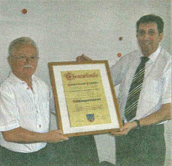 Gemeinde Hunderdorf bei einer kleinen Feierstunde im Rathaus gewürdigt. Amtsnachfolger Hans Hornberger überreichte dabei an Gerd Peschke eine Ehrenurkunde der Gemeinde. Bürgermeister war Peschke von 1992 bis 2008, 2. Bürgermeister von 1990 bis 1992, 3. Bürgermeister von 1984 bis 1990 sowie Gemeinderatsmitglied von 1972 bis 1978. Am 8. Mai hat der Gemeinderat beschlossen, an Peschke die Ehrenbezeichnung „Altbürgermeister“ zu verleihen. Als äußeres Zeichen des Dankes für die mehr als 30 Jahre ehrenamtliche Arbeit in der Gemeindepolitik wurde Peschke auch die Goldmünze der Gemeinde Hunderdorf überreicht.