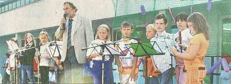 Die Abschlussfeier im Pavillon der Hauptschule wurde musikalisch vom Schülerchor mit Schul-Liedern gestaltet und mit zwei Flötenstücken der Schüler der Klasse 3a unter Leitung von F. Grill eröffnet.