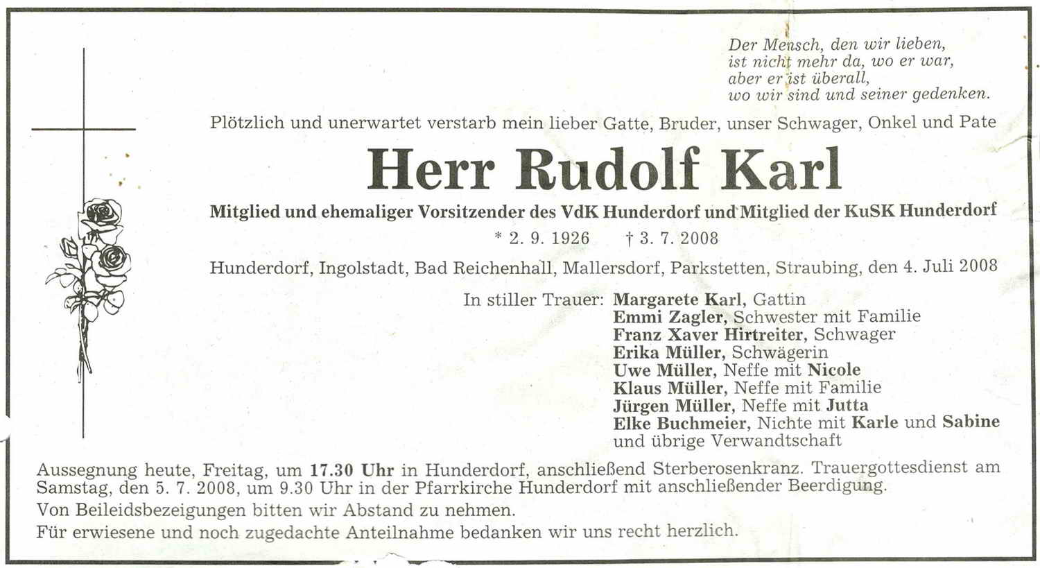 Aussegnung heute, Freitag, um 17.30 Uhr in Hunderdorf. anschließend Sterberosenkranz. Trauergottesdienst am Samstag, den 5. 7. 2008, urn 9.30 Uhr in der Pfarrkirche Hunderdorf mit anschließender Beerdigung.