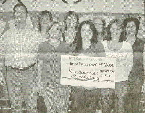 SPENDE Der Elternbeirat des Kindergartens Sankt Nikolaus in Hunderdorf hat an die Kindergartenleiterin F. Stadler vor Kurzem eine Spende in Höhe von 2000 Euro übergeben. Durch das Engagement des Elternbeirats bei Veranstaltungen wie dem Kinderfasching und dem Frühjahrsbasar und auch durch die Unterstützung der Eltern wurde dieses Geld aufgebracht. Mit einem Teil des Geldes konnte der Preis für den Familienausflug um die Hälfte reduziert werden. Der Großteil ist für eine Spielküche mit Schrank, einen Schminktisch sowie einen Puppenwickeltisch vorgesehen. — Bild: Bei der Scheckübergabe: Ein Teil des Elternbeirates sowie F. Stadler und (von links) St. Diewald, D. Weiß, M. Fuchs, A. Simmich, A. Stadler, S. Kuffner, S. Pflügl, H. Hagn. (Foto: sp)