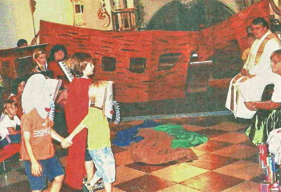 Es folgte das Tagesgebet „Vater im Himmel, du hast die Welt erschaffen“ und das Lied „Du hast uns deine Welt geschenkt“. Mit Können und Begeisterung trugen die Kinder das Rollenspiel: Die Arche Noah vor. Dabei führte ein als Noah verkleidetes Kind alle Lebewesen in die in der Kirche aufgebaute Arche hinein und nach Ende der großen Flut schickte er eine Taube mehrmals aus. Nachdem diese nicht mehr zurückkehrte wusste Noah, dass die Erde trocken war und alle verließen die Arche und waren die einzigen Überlebenden.