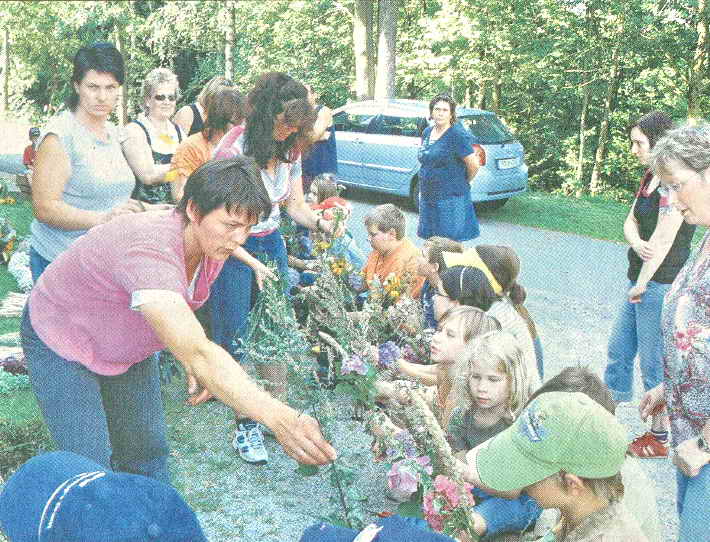 Die Kräuterbuschen stammen eigentlich aus einem heidnischen Brauch, wobei die magischen Zahlen von Bedeutung waren. Der Brauch wurde dann später von der katholischen Kirche übernommen, wusste die Pädagogin zu erzählen. Nach einer Stärkung mit frisch-gebrautem Kräutertee machten sich die Kinder anschließend schon ganz eifrig an das Binden der Buschen, wobei die anwesenden Muttis ihnen die dazu gehörenden Kräuter darreichten.