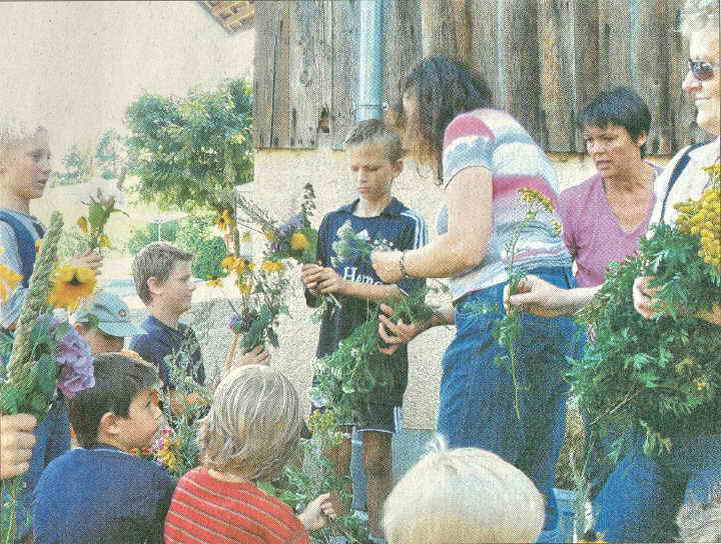 Über vierzig Mädchen und Buben lernten am Donnerstagnachmittag bei einer Wanderung rund um den Weinberg bei Hunderdorf Kräuter und Blumen kennen, die man für einen Kräuterbuschen für Maria-Himmelfahrt braucht.