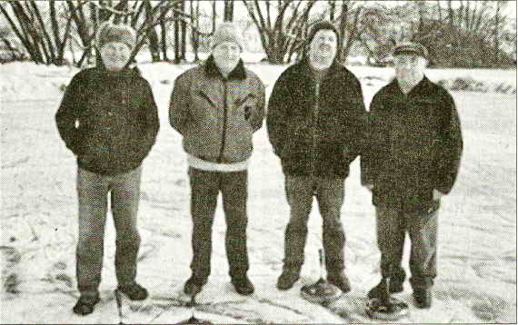 VEREINSMEISTERSCHAFT. Am Hunderdorfer Eisweiher herrschen beste Eisverhältnisse. So konnte die Eisstockabteilung die Vereinsmeisterschaft des SV Hunderdorf auf Natureis durchführen. Dazu hatten sich 20 Stockschützen eingefunden. Die Moarschaft Arno Gerhardt, Xaver Baier, Werner Beck und Rudi Müller wurden verdient Vereinsmeister 2009 auf Natureis. Den zweiten Platz sicherten sich Ludwig Buchs, Erwin Bierlmeier, Ferdl Hartmannsgruber und Karl Riepl. Hans Holmer, Markus Bierlmeier, Karl Spranger und Karl Zitzelsberger kamen auf den 3. Platz. Beide Teams wiesen ein ausgeglichenes Punkteverhältnis von 4:4 auf. Die Mannschaft Josef Hagn, Josef Ammer, Max Holzapfel und Erwin Feldmeier jun. belegte den vierten Platz, während die Schützen Erwin Feldmeier sen., Wolfgang Tinauer, Manfred Aich und Alfons Niedermeier Rang fünf erreichten. – Bild: Die neuen Vereinsmeister auf eisigem Boden. (Foto: he)