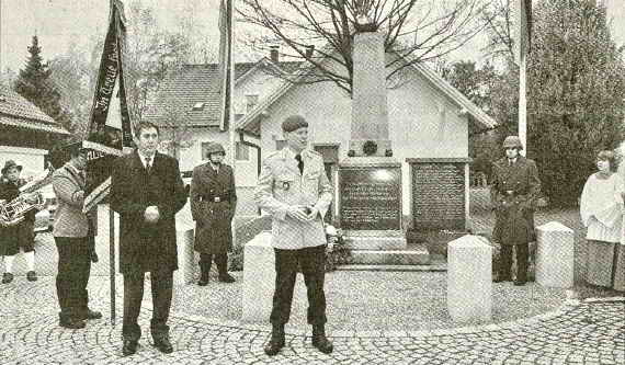 Nach der Messfeier nahmen Bürgermeister, Gemeinderäte, der VdK-Ortsverein, KuSK und die vier Feuerwehren Au vorm Wald, Gaishausen, Hunderdorf und Steinburg und einige Pfarrangehörige Aufstellung am Ehrenmal, bei dem zwei Soldaten der Bundeswehr Bogen Mahnwache standen. Sodann sprach Pfarrer Martin Müller Fürbitten und Gebete für die Opfer von Krieg und Gewalt und Frieden auf der Welt.