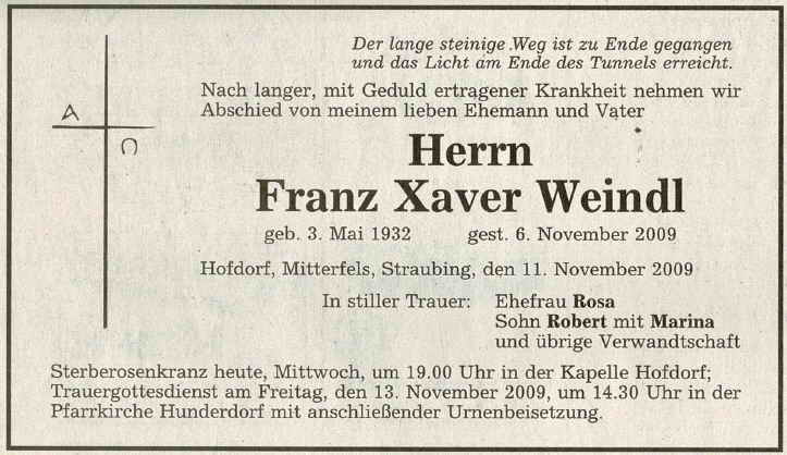 Sterberosenkranz heute, Mittwoch, um 19.00 Uhr in der Kapelle Hofdorf; Trauergottesdienst am Freitag, den 13. November 2009, um 14.30 Uhr in der Pfarrkirche Hunderdorf mit anschließender Urnenbeisetzung.