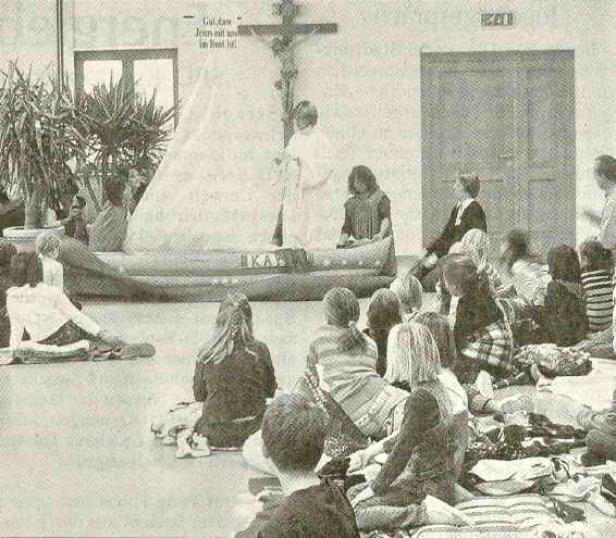 Die Kinder und Betreuer stellten sich mit dem Kennenlernspiel „Sag mir, wer bist du?“ vor. Dann spielten die Mitglieder des Familien-Gottesdienstkreises die Geschichte mit dem Titel „Der Sturm auf dem See — wir gehen nicht unter“ und wollten damit den Kindern näherbringen, wie Jesus zu uns sein will.