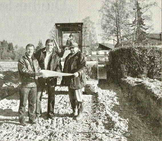 MIT DEN WEGEBAUTEN in den Ortsteilen Hoch, Stockwies und Öd sind derzeitig drei Hoferschließungsmaßnahmen der Gemeinde Hunderdorf im Laufen. Derzeitig wird im dritten Abschnitt in Öd noch der Unterbau erstellt. Im Verlauf der nächsten Woche ist vorgesehen, die drei Ausbauteilbereiche mit der Deck- und Feinschicht zu asphaltieren. Bürgermeister Hans Hornberger freute sich anlässlich einer Baustellenbegehung, dass diese Maßnahmen bei veranschlagten Kosten von rund 140 000 Euro durchgeführt werden können. Die Fahrbahn erhält eine Breite von drei Metern zuzüglich Bankett und teilweise Straßengraben. — Bild: Bürgermeister Hornberger (Mitte) im Gespräch mit dem Firmenchef Alois Rothammer (rechts) und Bautechniker Franz Xaver Fleischmann (Ing.- Büro KEB) bei der Hoferschließung in Öd. (Foto: xk)