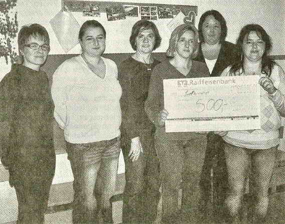 Großeltern und ehemalige Kindergartenkinder besuchten an diesem Tag den neu renovierten Kindergarten. Aus Anlass des heurigen 50-jährigen Bestehens des Kindergartens war auch eine Chronik- und Bilderausstellung zu sehen Die Besucher nutzten auch die Möglichkeit, sich beim gemütlichen Kaffee und Kuchen zu stärken. Ein stattlicher Betrag von 351 Euro kam so aus den diversen Aktivitäten zusammen. Der Elternbeirat stockte auf runde 500 Euro auf. So konnte jeder Kindergartengruppe ein Betrag von 100 Euro übergeben werden. Davon können zusätzliche wünschenswerte Spielmaterialien angeschafft werden. An dieser Stelle richtet die Kindergartenleitung und der Elternbeirat vielen Dank an alle fleißigen Kuchenbäcker und Helfer sowie an alle Besucher, die an diesem Tag für den Kindergarten großzügig gespendet haben. – Bild: Elternbeiratsvorsitzende Manuela Fuchs (3. von rechts) übergibt im Beisein von Mitgliedern des Elternbeirates den Spendenbetrag an die Kindergartenleiterin Alexandra Stadler (rechts). (Foto: xk)