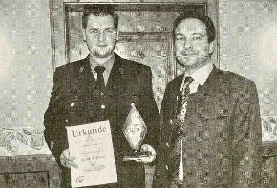 Der stellvertretende KJR-Vorsitzende Robert Dollmann zeichnete mit der Jugendraute den 2. Kommandanten Stefan Altmann (links) für seine engagierte Jugendarbeit aus. (Foto: xk)