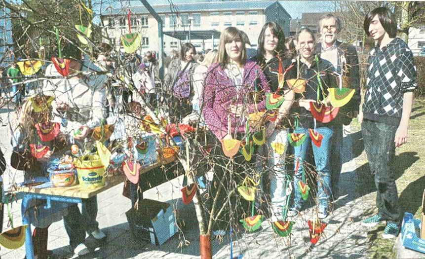 FLOHMARKT FÜR HAITI. In der Volksschule Hund er dorf fanden in der letzten Zeit viele Aktionen zugunsten der Erdbeben-Opfer in Haiti statt, die mit einem Flohmarkt am letzten Schultag vor den Osterferien ihren Abschluss fanden. In der Hauptschule wurden während der Fastenzeit Sparbüchsen aufgestellt, in denen alle Schüler Spenden einwarfen. F. Bauer verkaufte auf Initiative der Schiller in den Pausen Kuchen und Pizzabrötchen für den guten Zweck. Am letzten Schultag vor den Ferien wurde im Schulhof ein Flohmarkt veranstaltet. Alle Klassen haben dafür gespendet und die Kinder und viele Erwachsene kauften Waren. Zudem wurden Bastelarbeiten für die Osterdekoration hergestellt, die ebenfalls angeboten wurden. In der Aula der Hauptschule konnten sich alle Besucher mit Kaffee und Kuchen stärken. Der Erlös dieser Aktionen wird nach den Schulferien für die Erdbeben-Opfer in Haiti gespendet. – Bild: Einige Schüler mit Rektor Reinhard Dietz (Zweiter von rechts) neben einem Verkaufsstand im Schulhof in Hunderdorf. (Foto: ws)