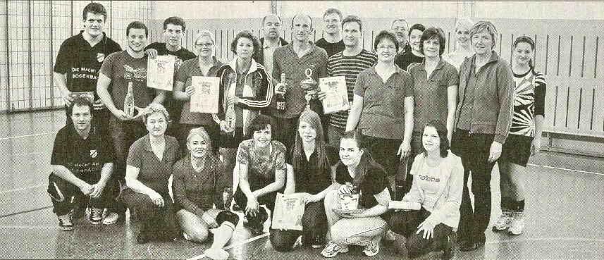 VEREINSMEISTERSCHAFT: Zur Volleyballmeisterschaft des SV Hunderdorf traten heuer wieder sechs Mannschaften an. Das Team Volleyball II mit Martina Hofmann, Christine Hainz, Johanna Wisniewski, Marietta Maier, Winfried Hofmann und Markus Huber überraschte und konnte gegen „Erste“, die mit Verena Rückert, Silvia Wisniewski, Nadine Kunze, Simone Rückert, Petra Ecker und Tobias Raschke aufliefen, mit 2:1 Sätzen die Oberhand behalten und Turniersieger werden. Alle Aktiven zeigten bei den Spielen großen Einsatz. Natürlich kamen auch Spaß und Freude bei den Wettkämpfen nicht zu kurz, obwohl alle Sportler schon recht ehrgeizig waren. Die Schiedsrichter Martina Hofmann, Verena Rückert, Silvia Wisniewski, Hans Freundorfer und Heinz Hentschirsch hatten bei dem fairen Auftreten aller Aktiven ein leichtes Amt. Abteilungsleiterin Isolde Freundorfer gab ihrer Freude über das erfolgreich verlaufene Turnier Ausdruck und nahm die Siegerehrung vor, wobei sie aber auch auf die Unterstützung aller Helfer und Helferinnen hinwies. Alle teilnehmenden Mannschaften konnten Sachpreise in Empfang nehmen. Den Meisterpokal erhielt die Volleyballabteilung.