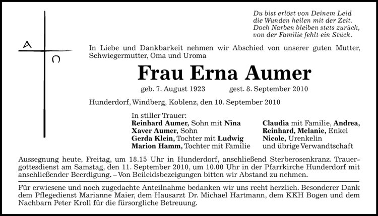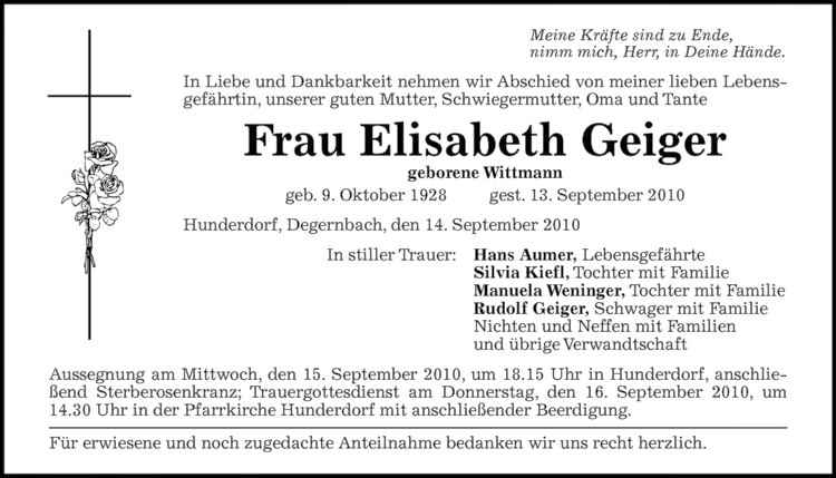 Aussegnung mit anschließendem Sterberosenkranz morgen, Donnerstag, um 18.15 Uhr in Hunderdorf; Trauergottesdienst mit anschließender Beerdigung am Freitag, den 1. Oktober 2010, um 14.30 Uhr in Hunderdorf.