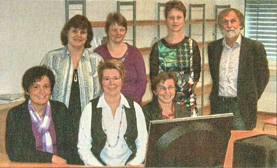 Testen schon einmal den künftigen Arbeitsplatz in der Bibliothek: Monika Ammer, Manuela Weninger, Sandra Meindl, Sylvia Schlech, Rosa Kraus, Alrun Simmich und Reinhard Dietz.