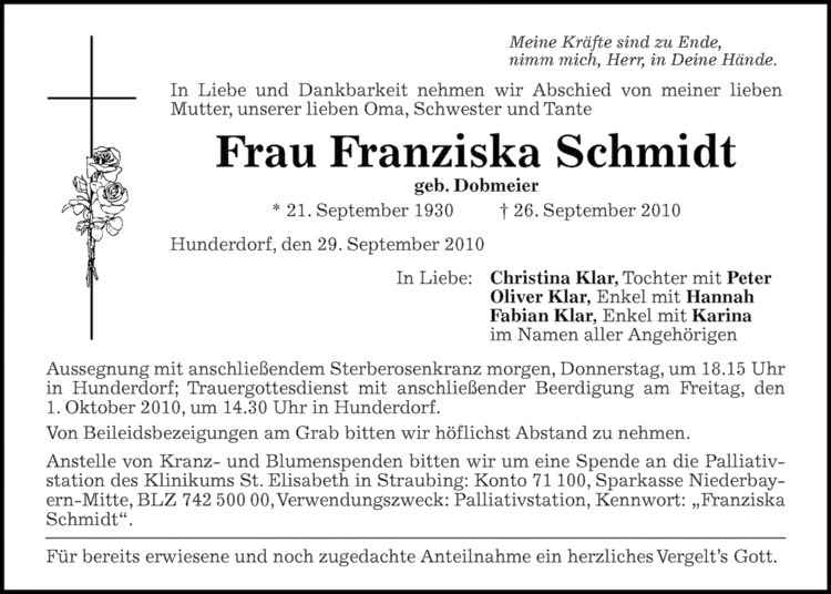 Anstelle von Kranz- und Blumenspenden bitten wir um eint. Spende an die Palliativstation des Klinikums St. Elisabeth in Straubing: Konto 71 100, Sparkasse Niederbayern-Mitte, BLZ 742 500 00,Verwendungszweck: Palliativstation, Kennwort: „Franziska Schmidt“.