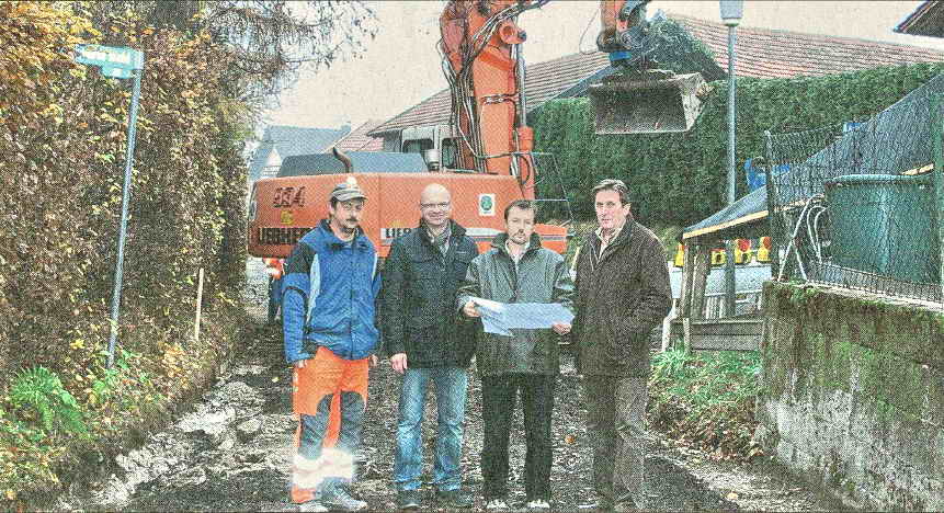 ANFANG NOVEMBER ERFOLGTE DER BAUBEGINN für zwei weitere Straßensanierungsarbeiten der Gemeinde Hunderdorf.. Die als Erste begonnene Maßnahme zur Deckenbauverstärkung im Ortsteil Au vorm Wald ist plangemäß im Laufen, freute sich Bürgermeister Hans Hornberger bei einem Baustellentermin. Seit etwa zwei Wochen werden von der beauftragten Baufirma Ohneis an der Ortsstraße Randsteine und Entwässerungsrinnen angepasst und der. Unterbau erneuert. Die Gesamtkosten der Maßnahme beziffern sich auf rund 160 000 Euro. Weiterhin sollen demnächst ebenso die beauftragten Sanierungsarbeiten am Nolteweg anlaufen. Dort hat der Zweckverband bereits dieser Tage die Hauptwasserleitung und die Hausanschlüsse erneuert. Demnächst soll auch hier die Straßeninstandsetzung beginnen, für die seitens der Gemeinde noch heuer Finanzmittel von rund 155 000 Euro bereitgestellt werden konnten, — Bild: Bei der Baustellenbesprechung in Au vorm Wald kamen zusammen Schachtmeister Hans Bielmeier und Bauleiter Matthias Sogerer (beide Firma Ohneis) sowie Bautechniker Franz Xaver Fleischmann (Ingenieur Büro KEB) und Bürgermeister Hans Hornberger (von links). (Foto: xk)