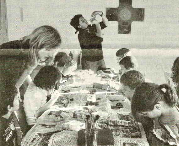 Nach dem Spiel verarbeiteten die Kinder in vier Gruppen die Geschichte mit ihren Gruppenleiterinnen. In einer Gruppe wurde das Thema noch mit Texten und Vorlagen vertieft. In einer anderen Gruppe fühlten die Kinder, beim Tasten von verschiedenen Materialien, dem steinigen Weg, den der Mann ging nach, machten Spiele und malten Bilder zu dem Gleichnis aus. In der nächsten Gruppe wurden große Kieselsteine als Symbol des steinigen Weges bemalt und in der letzten Gruppe machten die Kinder eine Fantasiereise bei meditativer Musik.