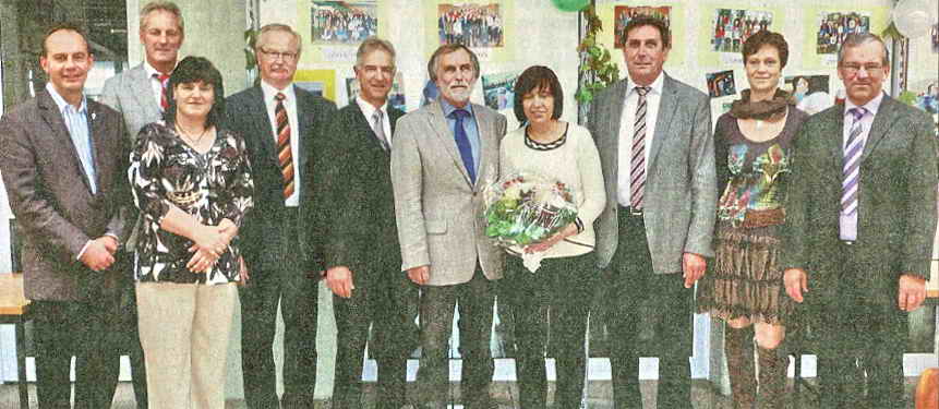 Pfarrer Pater Martin Müller, Schulleiter und Konrektor Kornelius Klar, ehemalige Elternbei-ratsvorsitzende Manuela Wenninger, Schulverbandsvorsitzender Hans Gstettenbauer, Rektor aus Mitterfels Gerhard Groß, scheidender Rektor Reinhard Dietz mit Frau, Bürgermeister Hans Hornberger, Elternbeiratsvorsitzende Alrun Simmich und Bürgermeister Rudi Seiden-ader (von links). (Foto: ws)