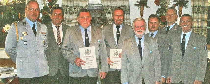 Die geehrten Mitglieder Willi Mühlbauer und Ernst Sacher (Dritter und Vierter von links) im Kreise von Hauptfeldwebel Andreas Dittrich, Bürgermeister Hans Hornberger, Vorstandsmit-glied Ludwig Schuhbauer, Vorsitzendem Roland Peschke, Kompaniechef Carsten Rohr und Vorstandsmitglied Karl Riepl (von links). (Foto: xk)