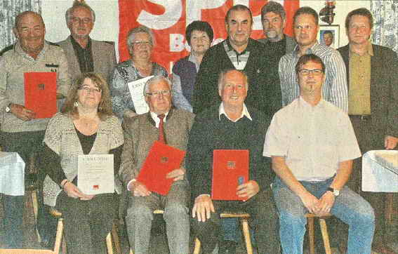 Bei den folgenden Ehrungen wurden zwölf SPD-Mitglieder für ihre langjährige Solidarität und Verbundenheit zur SPD von Stefan Diewald und seinem Stellvertreter Roland Peschke mit einer Urkunde geehrt. Für 25, 40 und 50-jährige Mitgliedschaft gab es zusätzlich Ehrennadeln beziehungsweise Ehrenbroschen.