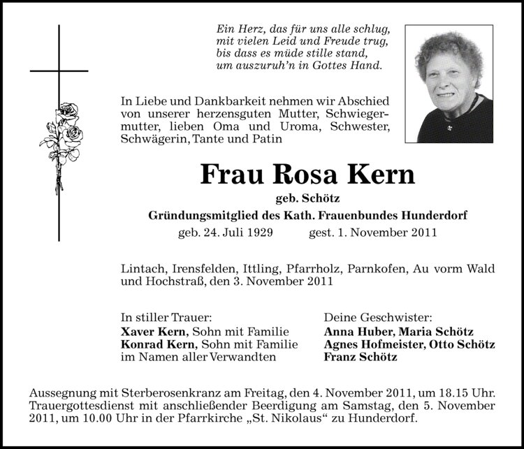 Trauergottesdienst mit anschließender Beerdigung am Samstag, den 5. November 2011, um 10.00 Uhr in der Pfarrkirche „St. Nikolaus“ zu Hunderdorf.
