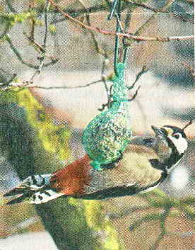 Frau Specht erfreut sich am Meisenknödel. (Foto: Paul Winderl)