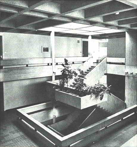 Alle Normalklassen gliedern sich um diese Halle im Erdgeschoß und Obergeschoß. Die Verwaltung ist im Obergeschoß eingeplant, so daß von hier aus eine optimale Übersicht gewährleistet ist. Im Obergeschoß ist dem Galeriegeschoß noch eine Pausenterrasse vorgelagert, die den Pausenbetrieb zentralisieren sollte. Diese Dachterrasse ist mit dem Hauptpausenplatz im Erdgeschoß über eine Freitreppe verbunden. Neben dem Haupteingang liegt eine zentrale Garderobenanlage, in unmittelbarer Nähe führt ein überdachter Gang zur Turn- und Schwimmhalle. Sämtliche Fachklassen wie Physik, Chemie, Küche, Bücherei sind im Untergeschoß untergebracht.