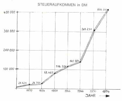 Diese Aufwärtsentwicklung findet ihren sichtbaren Niederschlag im statistischen Zahlenmaterial des Steueraufkommens von Hunderdorf. Die nachstehende Grafik soll das stetige Anwachsen veranschaulichen: