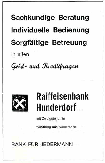 Hand in Hand mit der wirtschaftlichen Aufwärtsentwicklung erfolgte eine merkliche Verbesserung der Lebensverhältnisse, ein Anstieg der Bautätigkeit und ein großzügiger Ausbau des Verkehrsnetzes; kurz, Hunderdorf fand den Weg aus einem armen, unterentwickelten Agrardorf zu einer entwicklungsfreudigen, neuzeitlichen Gemeinde.