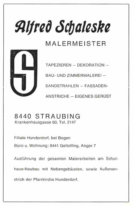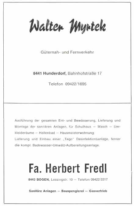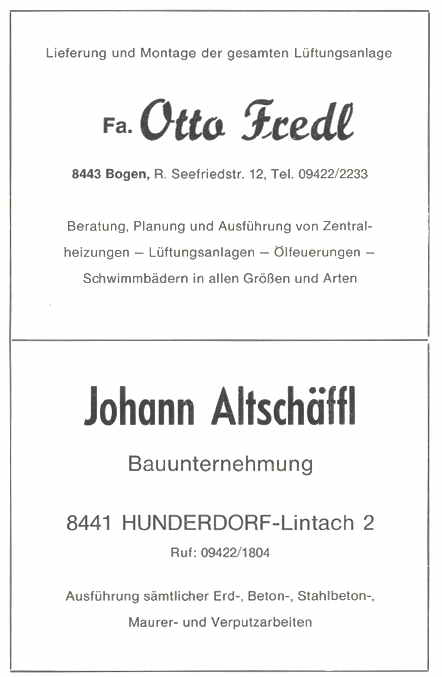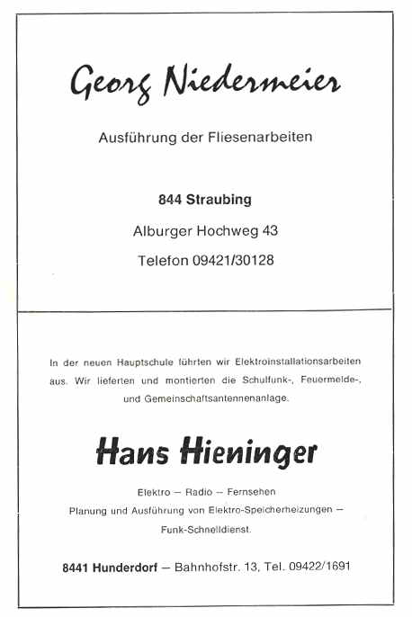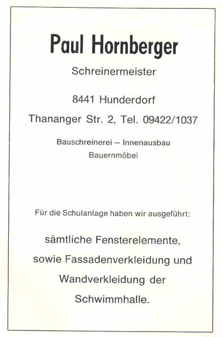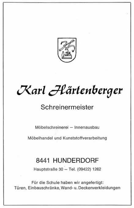 Als Leiter der Verbandsschule Hunderdorf darf ich im Namen des gesamten Lehrkörpers und als Sprecher für unsere Schulkinder, der Gemeinde Hunderdorf, vor allem dem 1. Bürgermeister. Härtenberger und allen Persönlichkeiten, die sich tatkräftig für den Bau des Schulhauses eingesetzt haben, meinen herzlichsten Dank zum Ausdruck bringen.