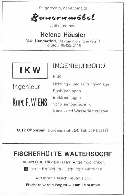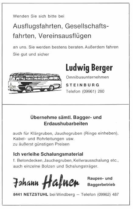 Erst wenige Jahre ist der Bayerwaldverein alt und doch gehört er bereits zu den zahlenmäßig stärksten und aktivsten Vereinen unserer Gemeinde. Der erste internationale, vom Bayerwaldverein ausgerichtete Wandertag im Herbst 1973 war ein voller Erfolg. Die Gedenkmedaille zeigt die Mühle des heimatlichen Hellsehers und Waldpropheten Mühlhiasl. Vorstand ist derzeit Hans Glas.