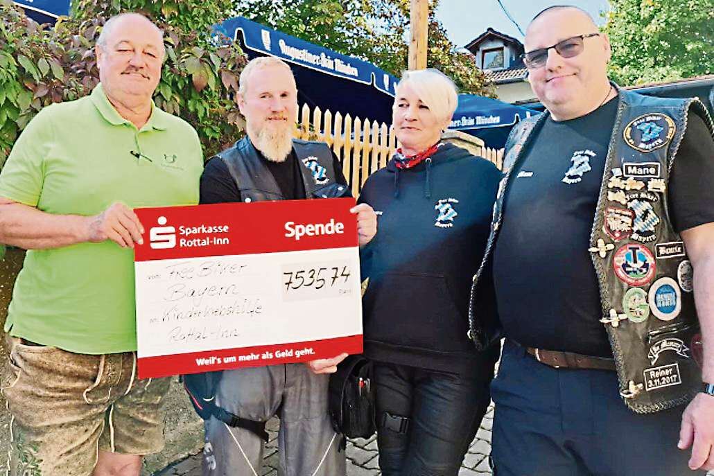 Vormittag vor der Spendenübergabe eine Stadtrunde, bei der viele Zuschauer am Straßenrand den vorbeifahrenden Bikern zuwinkten. Im Rottaler Augustiner Bräu wurden die Motorradfahrer von Josef Hofbauer, dem Vorsitzenden der Kinderkrebshilfe Rottal-Inn, und seinem Team empfangen. Hofbauer berichtete über die Entwicklungen im Verein seit dem letzten Besuch der Gruppe und stellte die zahlreichen Projekte vor, die die Kinderkrebshilfe dank Spenden verwirklichen konnte. Entsprechend groß war die Freude über die großzügige Unterstützung durch die „Free Biker Bayern“. Ihr Leiter Manfred Edenhofer aus Pfelling bei Bogen überreichte einen Scheck in Höhe von 7.535,74 Euro. Der beeindruckende Betrag setzte sich aus verschiedenen Aktionen zusammen: viele kleine Einzelspenden, Sammlungen und Stammtischaktionen sowie der Tombola beim Sommerfest. Besonders erwähnenswert waren eine großzügige Spende der Pizzeria Marilena aus Gangkofen im Wert von 500 Euro, die Trinkgeldkassen-Spende mit 765 Euro sowie der Erlös aus dem Kalenderverkauf der „Biker-Mädels“ mit stolzen 2.000 Euro. Die Vertreter der Kinderkrebshilfe bedankten sich bei den Bikern für ihr Engagement zugunsten von Kindern. Beim Abschied wurden bereits Pläne für das nächstjährige Treffen zwischen den mittlerweile freundschaftlich verbundenen Vereinen – den Free Biker Bayern und der Kinderkrebshilfe Rottal-Inn – geschmiedet. – Bild (von links): Josef Hofbauer (Vorstand der Kinderkrebshilfe), Maxi Hammes, Petra Fandl und Manfred Edenhofer. Foto: Manfred Edenhofer Quelle: Bogener Zeitung, 13.09.2025