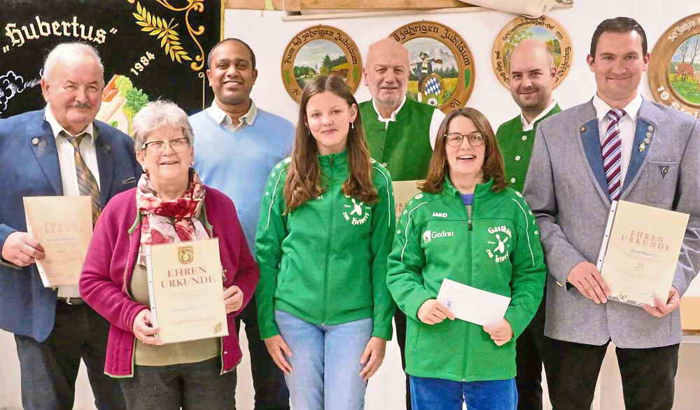 Ein halbes Jahrhundert ist Josef Hiendl senior Mitglied und Heribert Wölfl, als Schütze mit der längsten Mitgliedsdauer bei den Hubertus-Schützen, bereits 60 Jahre. Von beiden erhielten die Anwesenden (ausgezeichnet mit BSSB-Ehrennadel in Gold) aus einem Kurzinterview interessante Vereinsdetails aus den 60er- und 70er-Jahren des vergangenen Jahrhunderts. Als langjährige Wettkampfschützen in den Diensten des Vereins gab es Gutscheine für 20 Jahre an Sandra Zollner und Josef Bayerl und für 45 Jahre an Josef Hiendl senior.