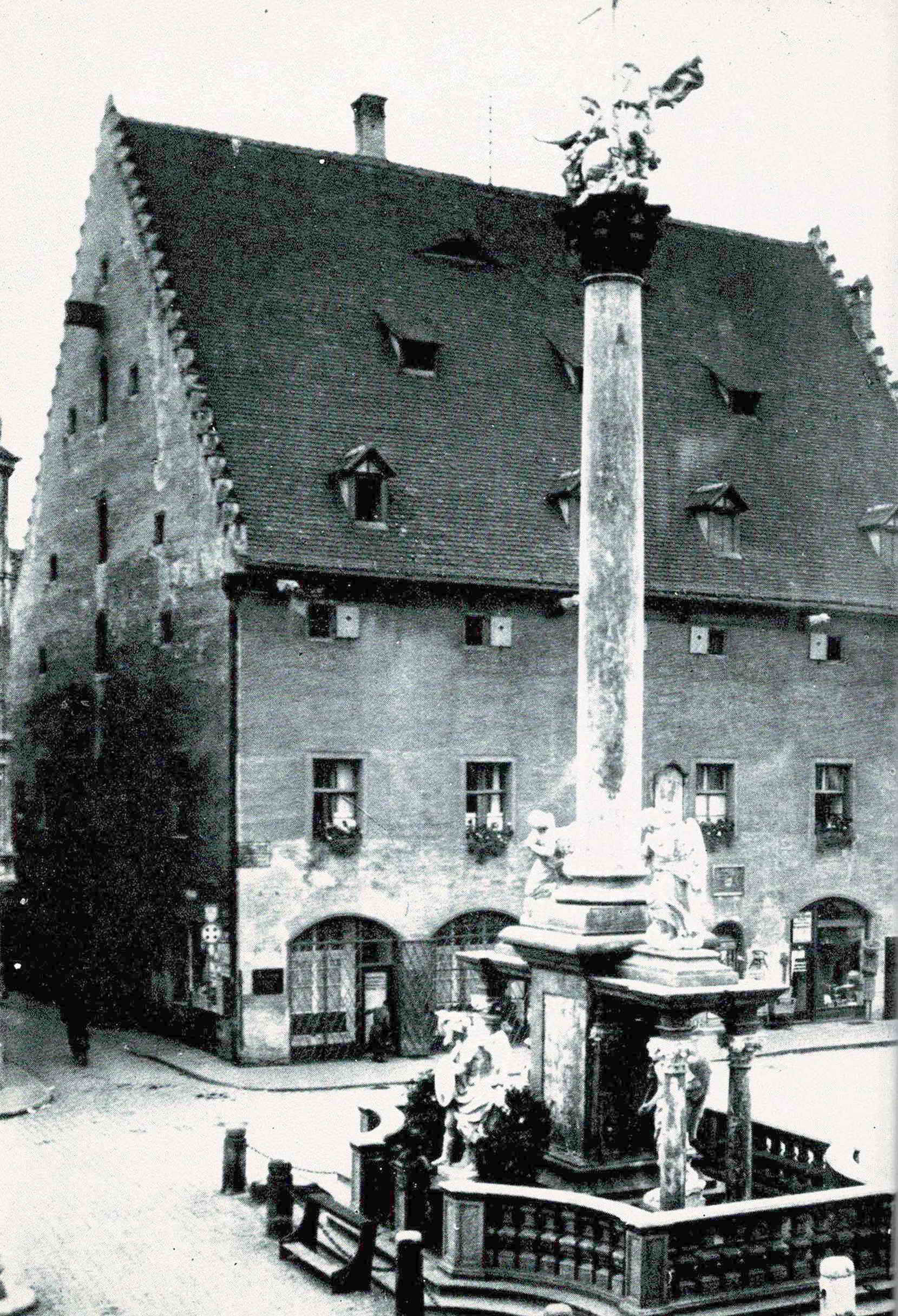 Das Bildchen aus dem Jahre 1910 zeigt, wie wohl sich unser alter Windberger Kasten im Schutz der Dreifaltigkeitssäule fühlte, immer noch in sein gotisches Kleidchen gehüllt. Droben am Dach sah man auch noch die vielen Luken, durch die einst das Getreide Kühlung erhielt und sich ausschwitzen konnte, und in der Ostwand steckte noch der Aufzugsgalgen für das eingesackte Zehentgetreide. Reizend auch die Neugier der Guckfensterchen unter der Scharrinne und die Perlenkette des Treppengiebels. Die Fensterzeile im Mittelstock präsentierte sich genau so vornehm wie jene an unserem jetzigen Rathaus, links vom Balkönchen. Drunten am Straßenpflaster aber lebte noch die Heimeligkeit altvertrauter, dämmriger Läden. Darin fühlte sich einst die heitere Bumillerin glücklich, wenn sie ihre Korbwaren, Besen, Bürsten und Fliegendatscher verkaufte.